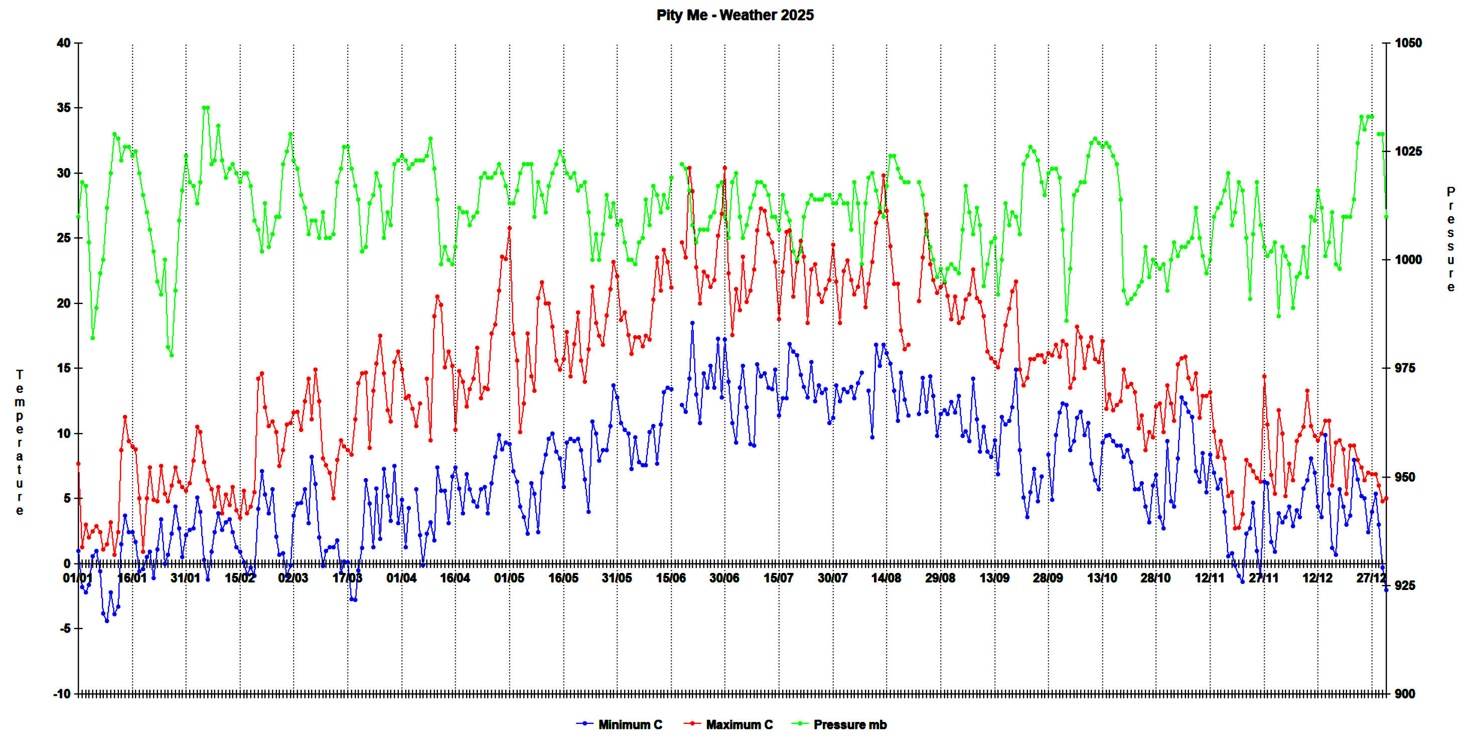 Below are the daily weather recordings (Minimum temperature (blue), maximum temperature (red), pressure (green)) from my back garden in County Durham. The records start in January 1997. The pressure data are not very accurate.